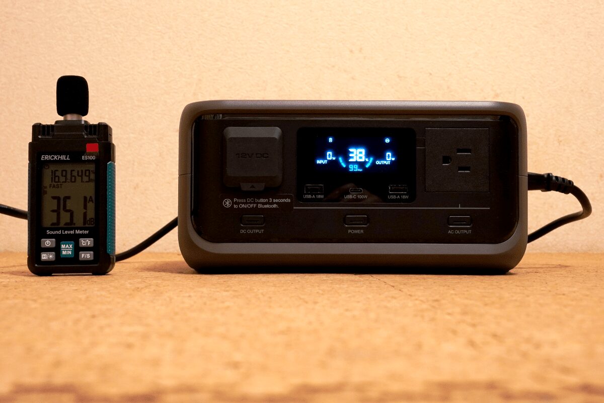充電前と充電中(急速充電300W)で数値上は0.3dBの差でしたが、ほぼ音の差は感じませんでした。かなり静かです。この静音性はデスク周りの電源としては優秀だと思います。