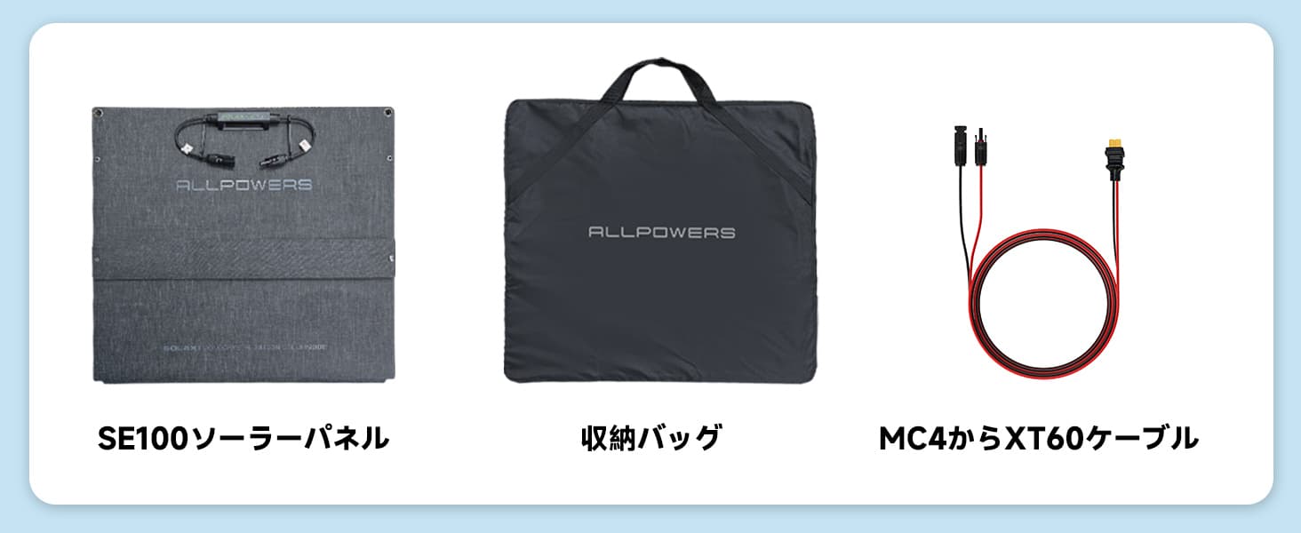 型番 ALLPOWERS SE100 ソーラーパネル ピーク電力 100W±5% 開路電圧(Voc) 24.48V 短絡電流(Ioc) 5.33A 最大電圧 (Vmp) 20.8V 最大電流(Imp) 4.8A ソーラーバネル光電変換率 23%-25% 使用温度 -20℃~60℃ 展開サイズ 1050mm±2mm×587mm±2mm×3mm±0.25mm 折りたたむサイズ 587mm±2mm×587mm±2mm×3mm±0.25mm 重量 3.8kg