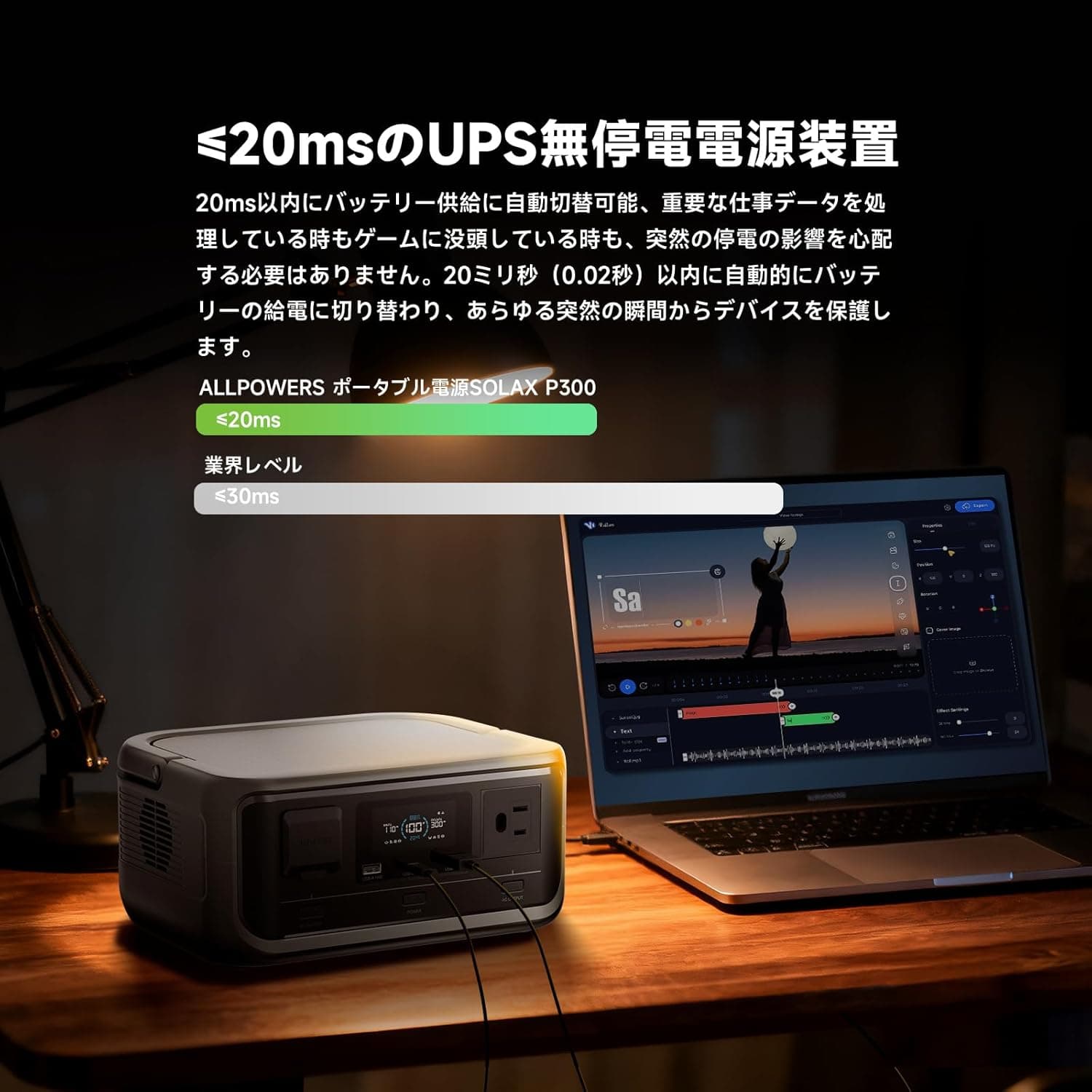- 停電時:VOLIX300から自動的に給電開始(0.020秒以内と爆速)