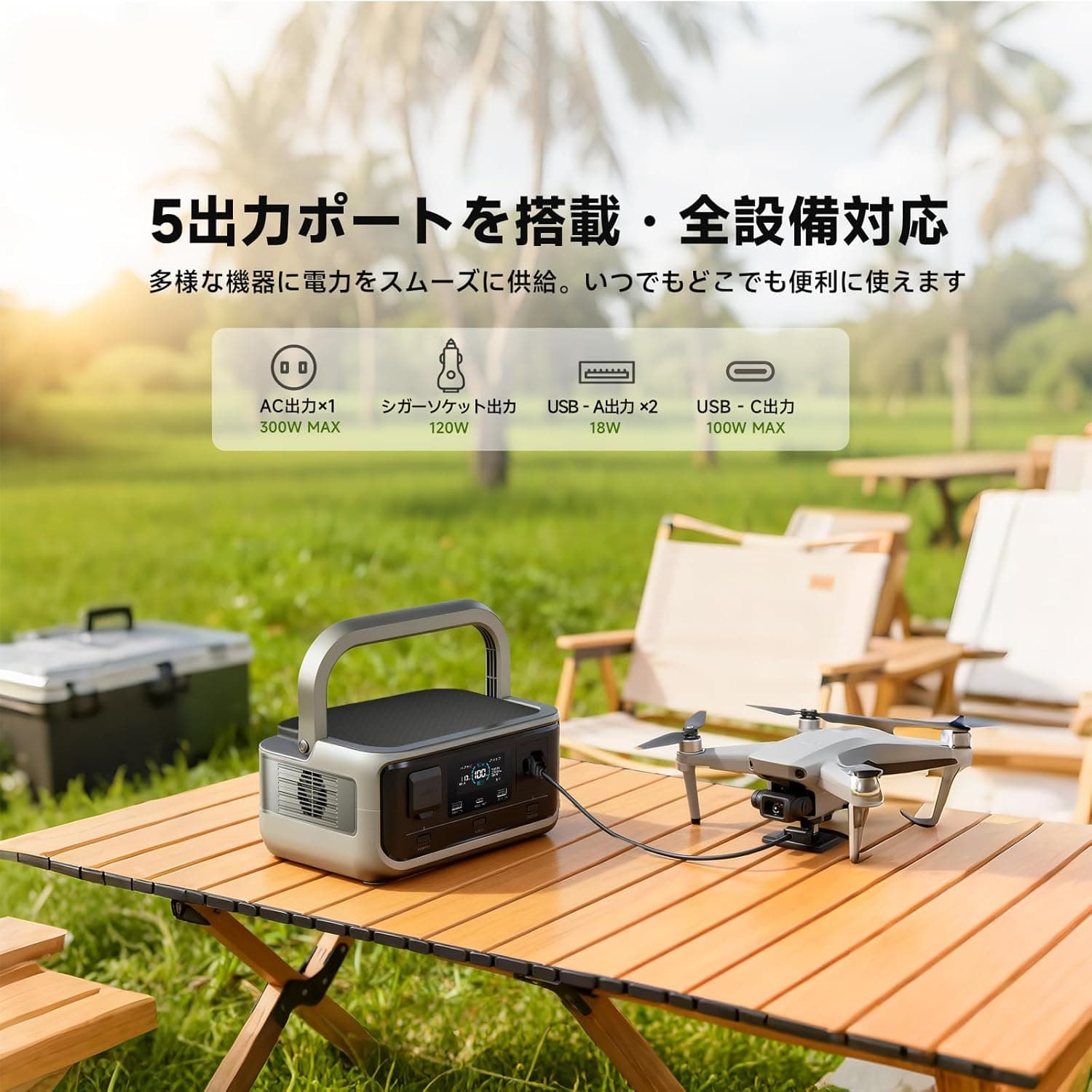 車より充電:12V/24V 最大110W対応出力ポート AC出力X1:定格出力300W(サ-ジ600W)