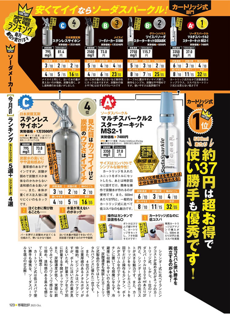 ・さらに他社はジュース等も炭酸にできるのが売りだが、1度に大量の炭酸を消費するため市販の炭酸飲料より割高になってしまう。それに比べて炭酸水しか作れないものの、ボトルをはめて押すだけで炭酸水ができるため、本モデルが最も優れている。